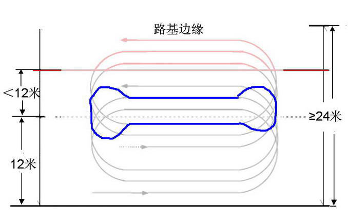 通過(guò)沖擊式壓路機(jī)“回形針環(huán)跑”路線一文中我們了解到,當(dāng)路基寬度大于等于24米時(shí),可采取“回形針環(huán)跑”路線(見(jiàn)下圖左),但是,當(dāng)路基寬度小于24米時(shí),沖擊式壓路機(jī)靠近中心位置時(shí),就會(huì)出現(xiàn)調(diào)頭位置不夠的情況(見(jiàn)下圖右紅色標(biāo)記處):