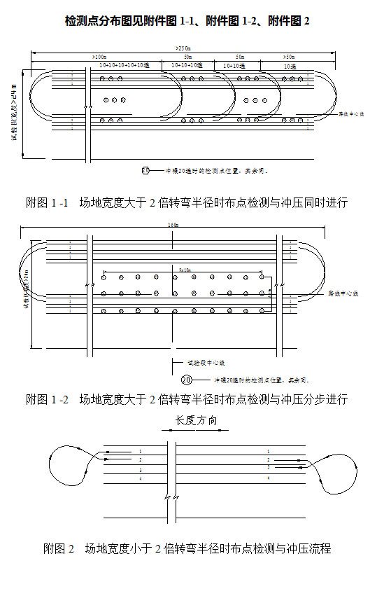 2.3 施工場地寬度大于沖擊壓路機(jī)轉(zhuǎn)彎直徑的兩倍時,以道路中心線對稱地將場地分成兩半,壓實道線如附圖1;施工場地的寬度小于兩倍轉(zhuǎn)彎直徑,可按附圖2的碾壓方式進(jìn)行,并根據(jù)實際情況在施工場地的兩端設(shè)置所需的轉(zhuǎn)彎場地。